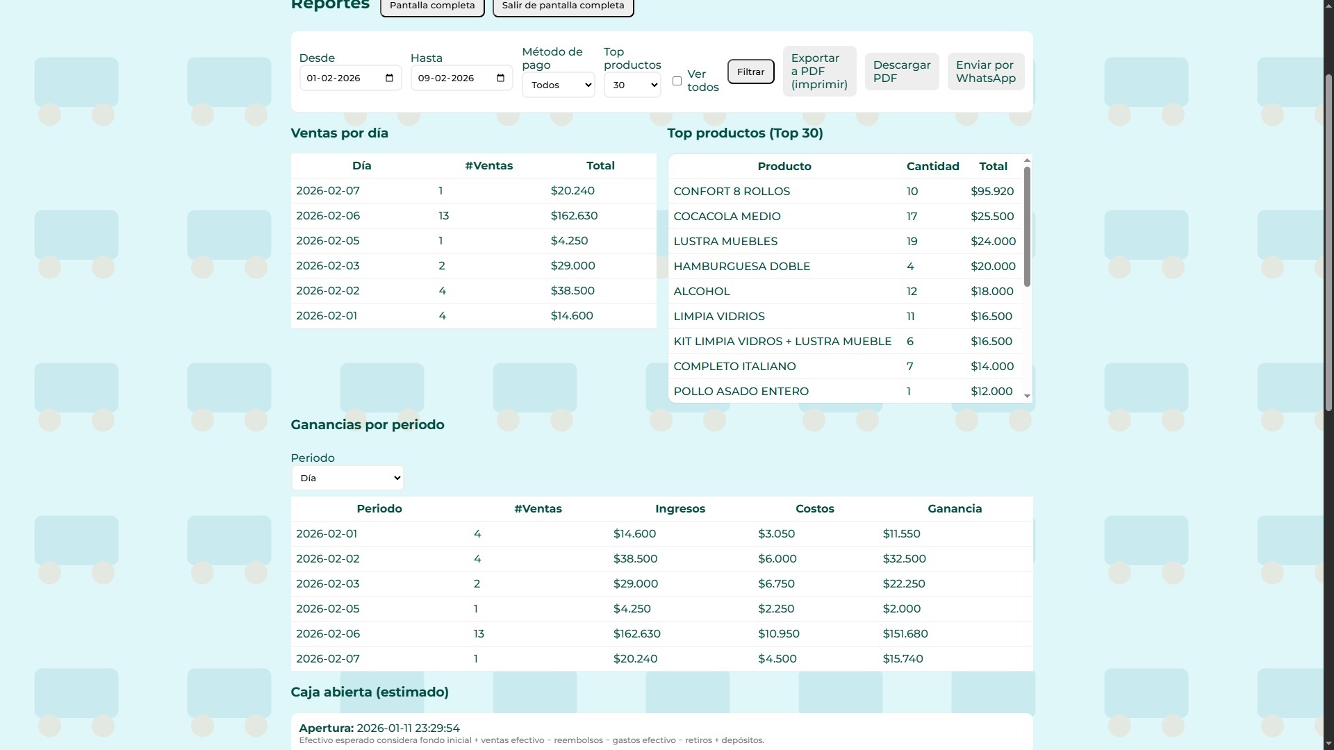 Control de mesas, propinas y turnos con trazabilidad por usuario.